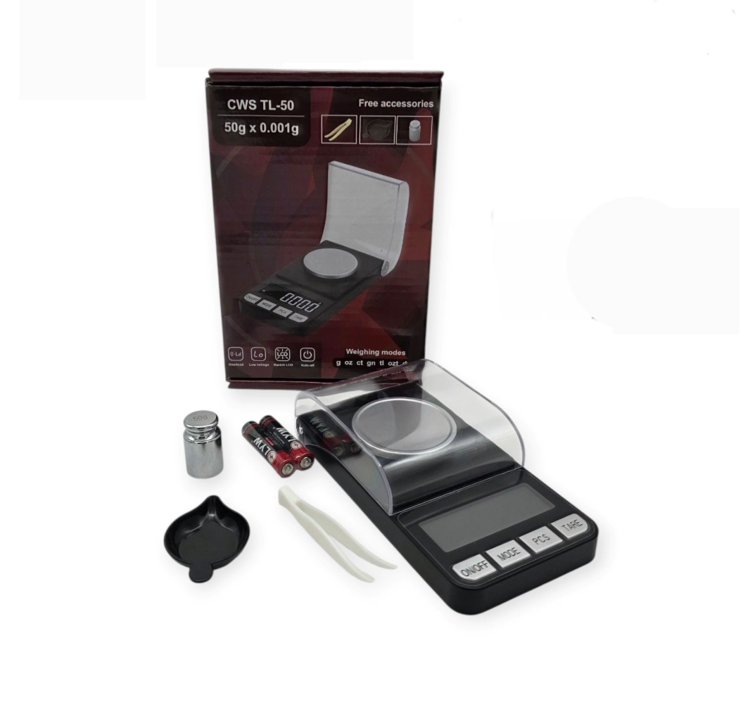 The CWS TL-50 has a 50-gram capacity with 0.001g precision, ideal for labs, jewellery stores, vape shops, and industrial applications.